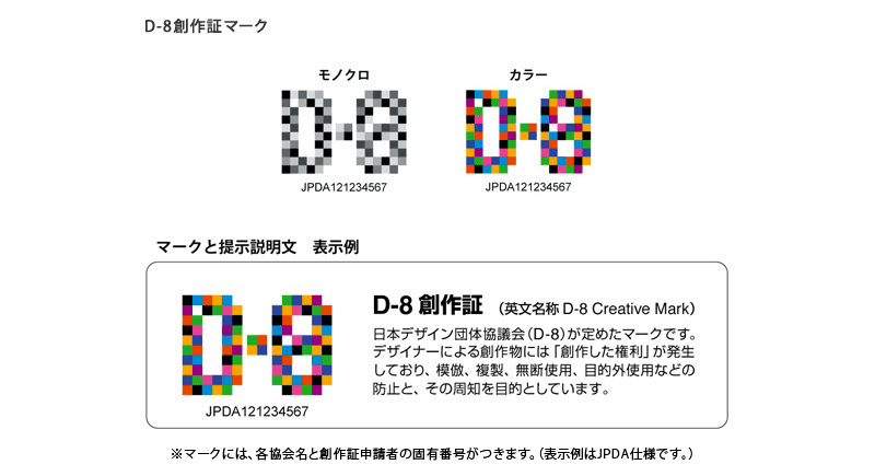 D-8創作証は、D-8デザイン保護研究会を構成する7団体が共同し、著作権法によって明白に保護されるポスターなどのデザインや美術工芸品はもとより、意匠法などによる登録手続きが完了していない、または登録を行う予定のない量産品のデザインについても、デザイナーが関わるすべての創作物には「創作した権利」が当然に発生していることをマークによってあらわし、業界並びに社会に向けて関心を喚起し、その周知と定着を図ることを目指しています。