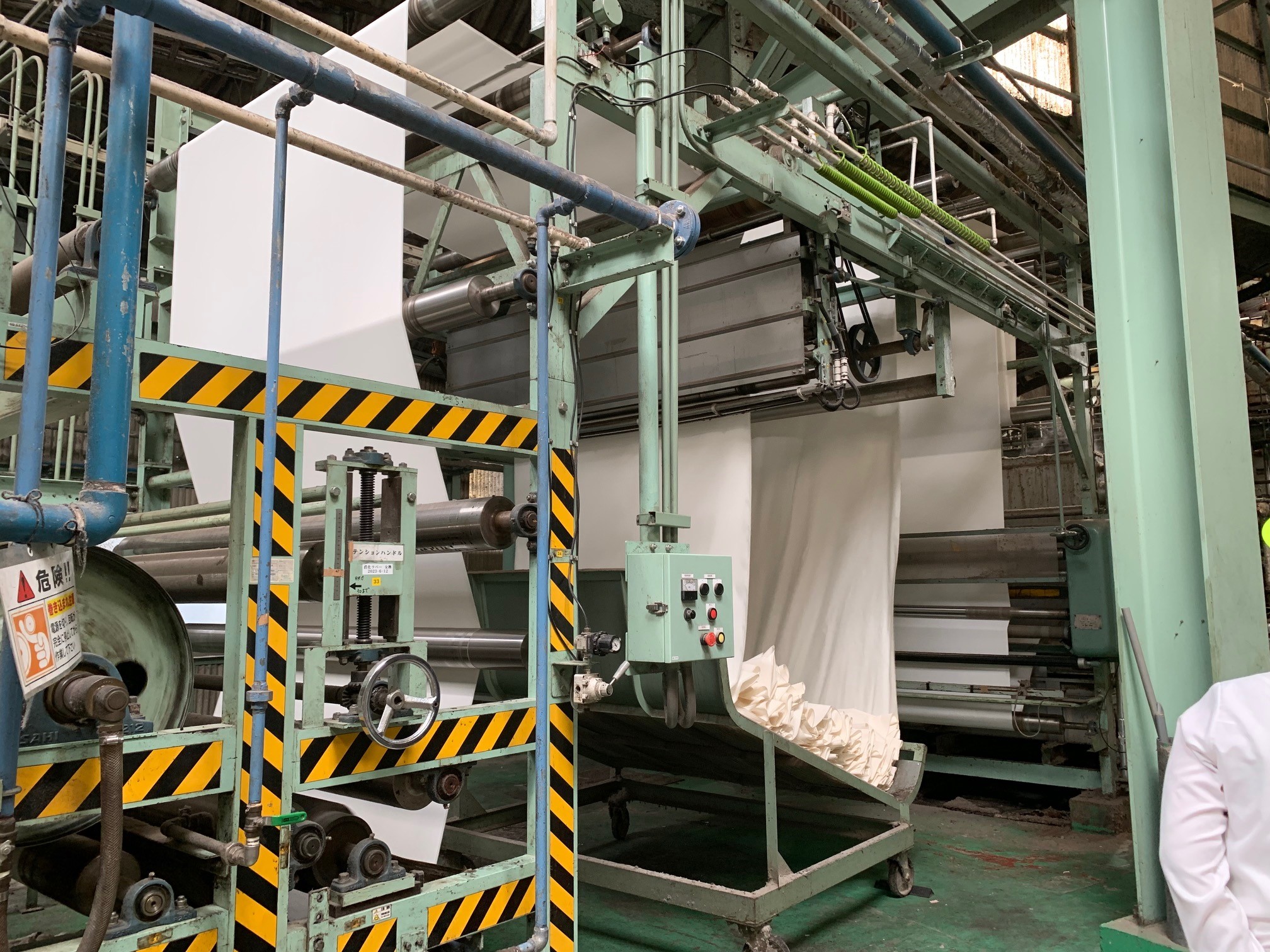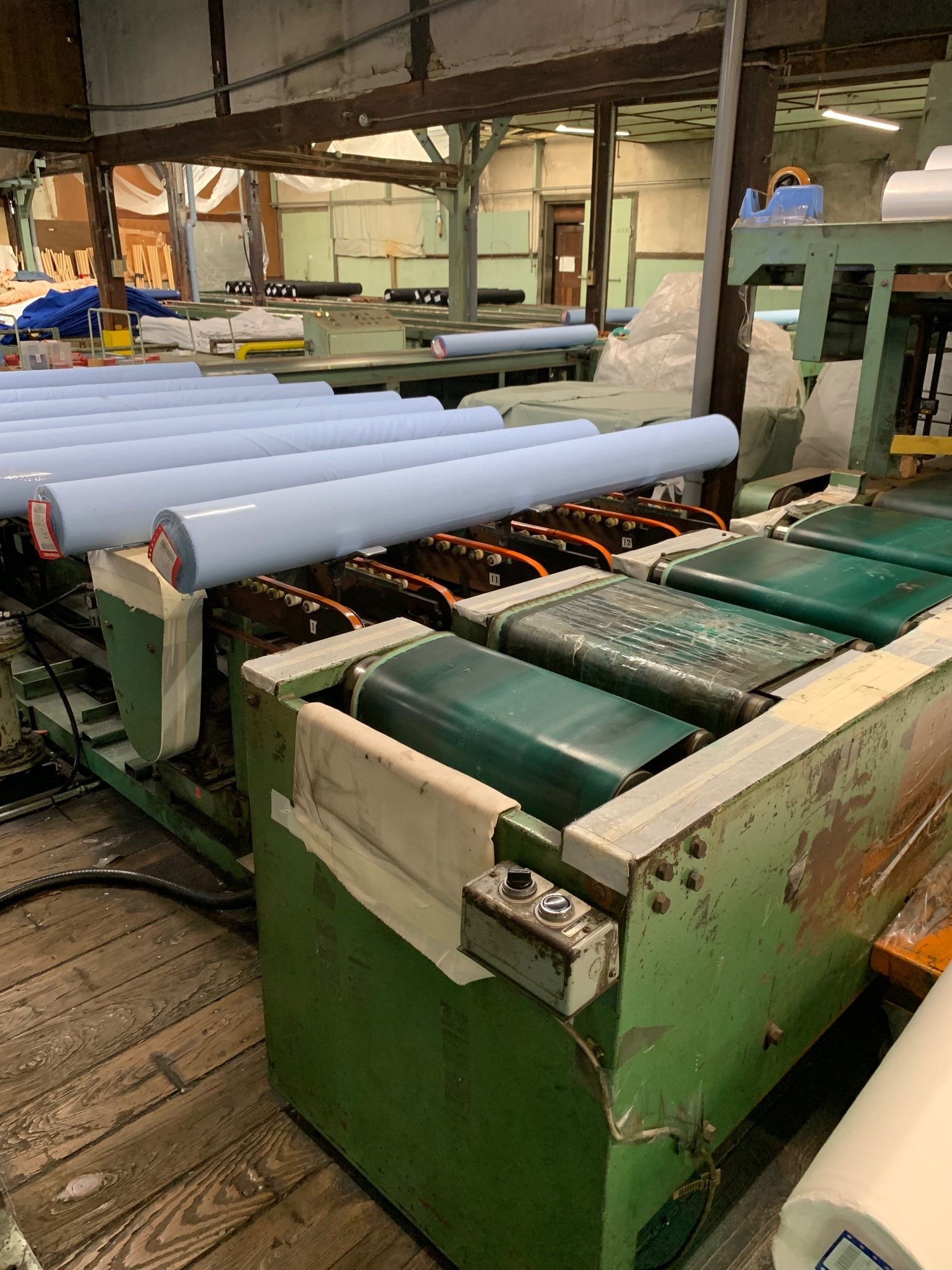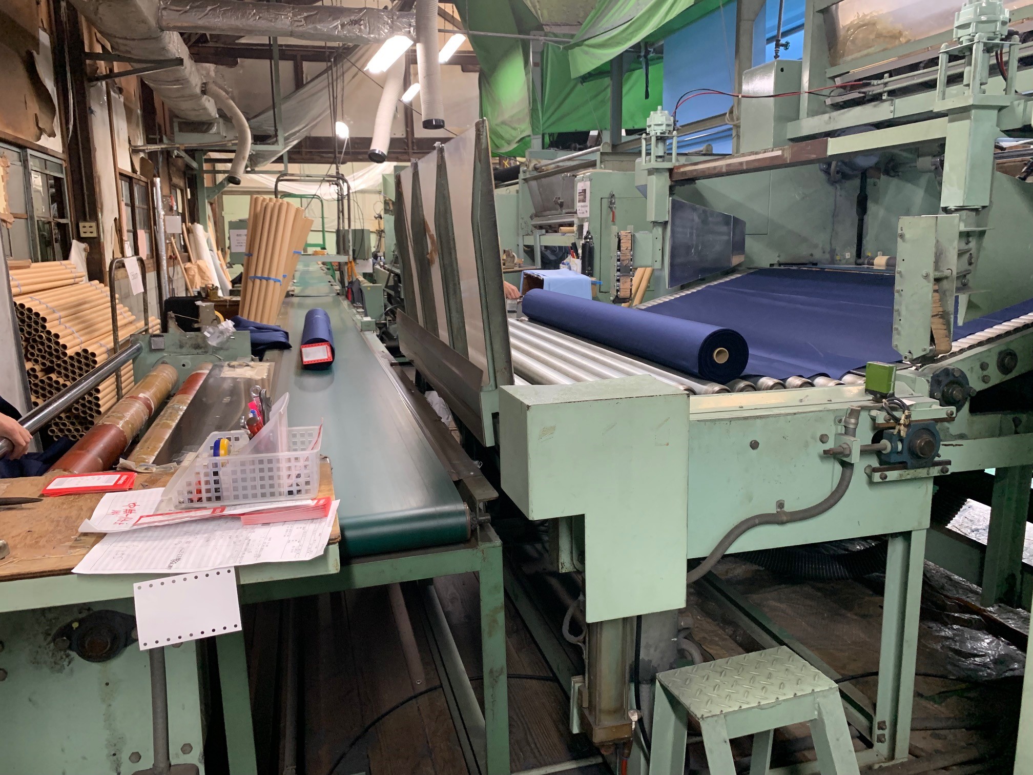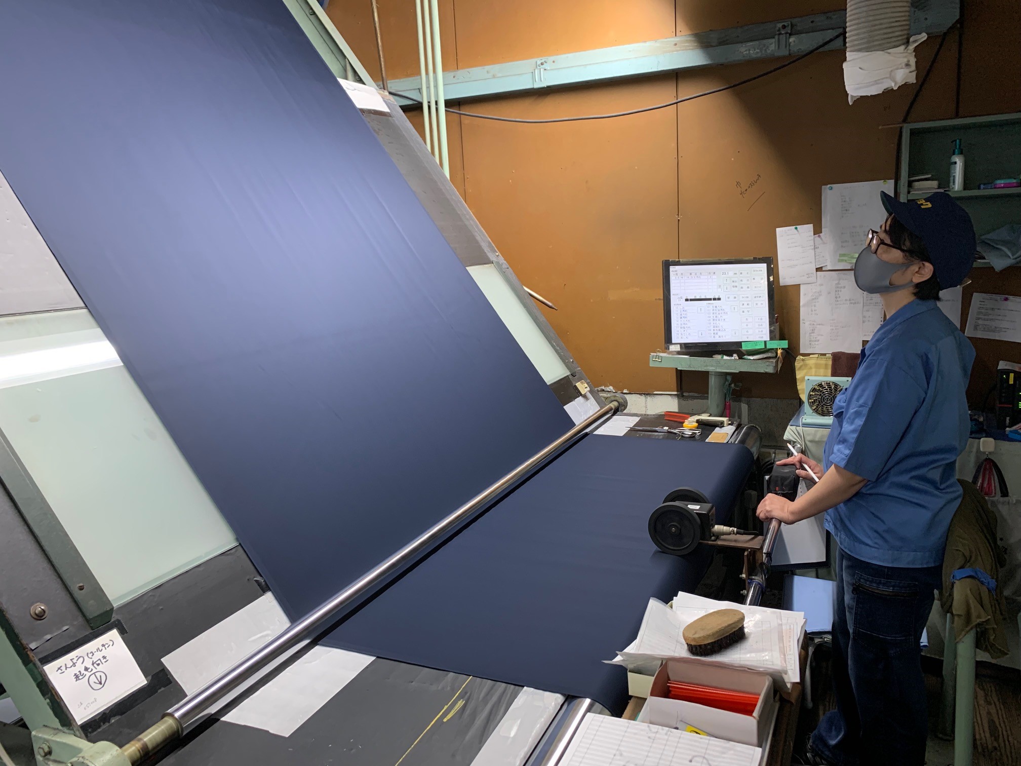 [写真]工程④ 検反(生地欠点、加工欠点を検査し、格付け(A反・B反・C反)を行う