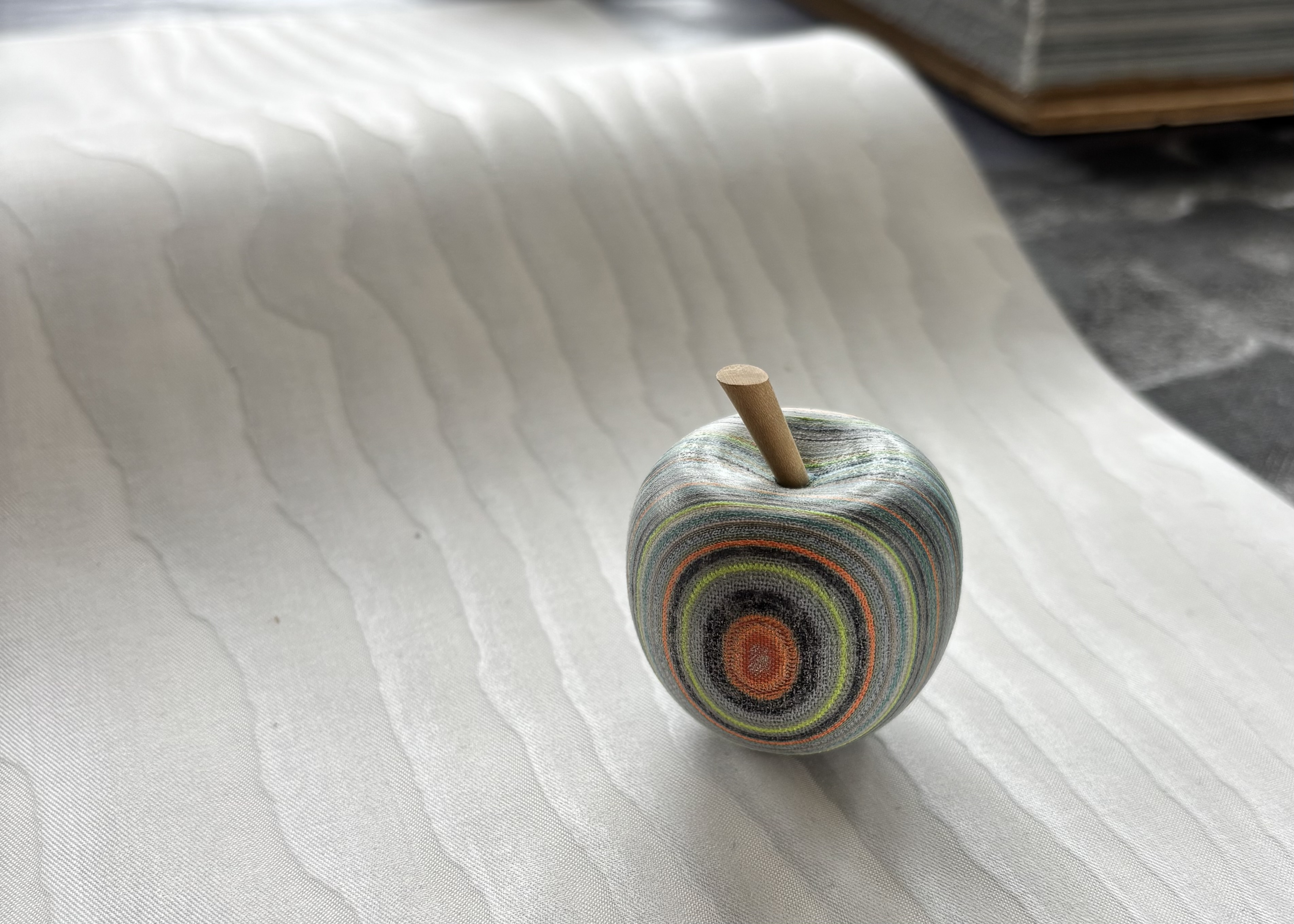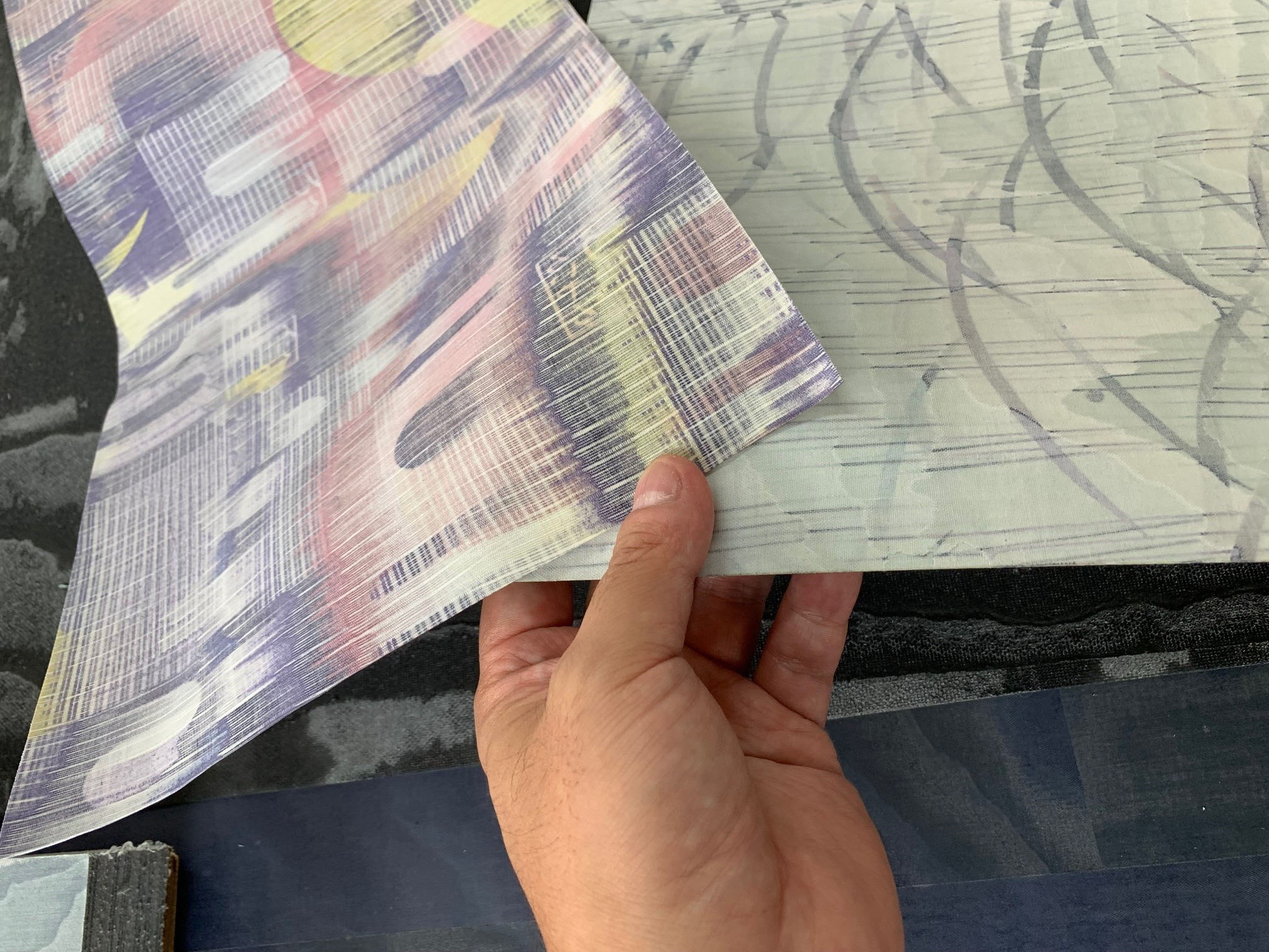 ・NUNOUSは、未活用布と植物由来ポリマーを数百枚積層し圧着したのち、水平に薄くスライスして製造します。一つとして同じもののない自然の木目や石目柄のように、再現性のない風合いをもつマテリアルであり、2018年の事業化以降、様々なアワードもいただき、今では国内はもちろん海外からも問い合わせ等を多くいただいています。