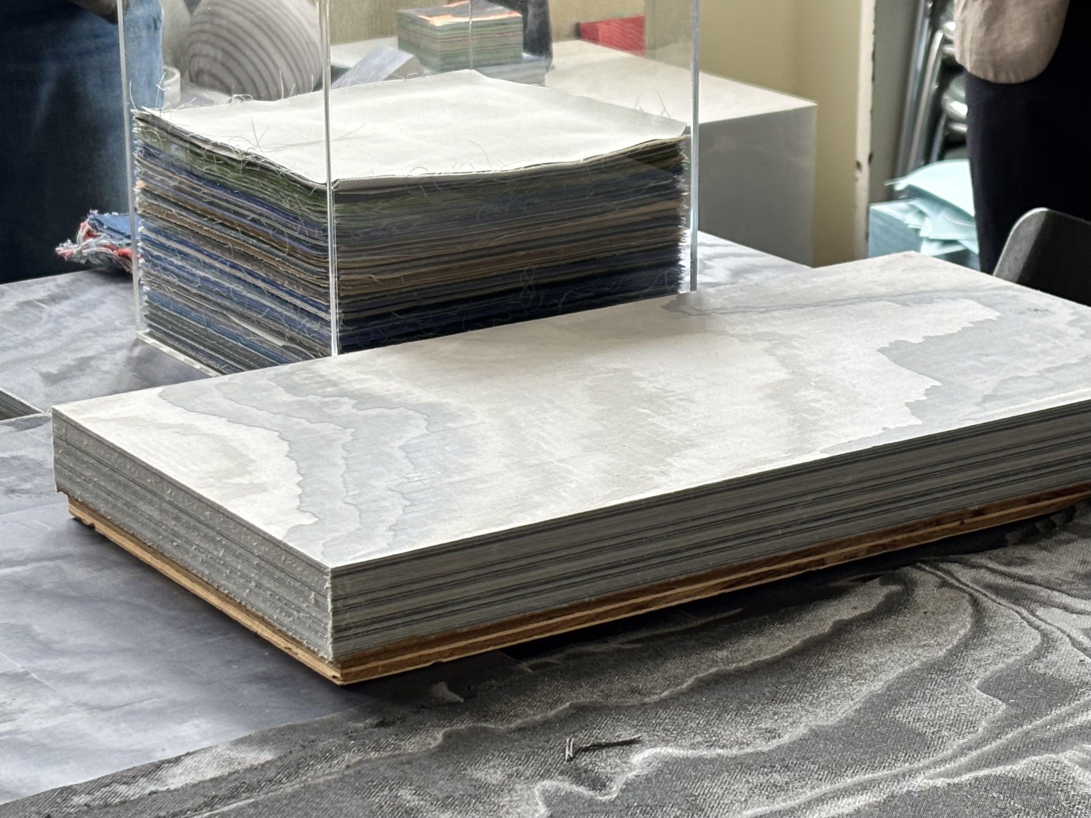 ・NUNOUSは、活用されていない布資源と植物由来ポリマーを数百枚積層し圧着したのち、水平に薄くスライスして製造します。
