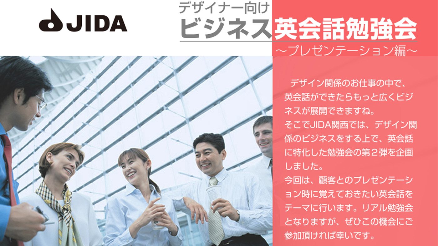 デザイン関係のお仕事の中で、英会話ができたらもっと広くビジネスが展開できますね。そこでJIDA関西では、デザイン関係のビジネスをする上で、英会話に特化した勉強会の第2弾を企画しました。今回は、顧客とのプレゼンテーション時に覚えておきたい英会話をテーマに行います。リアル勉強会となりますが、ぜひこの機会にご参加頂ければ幸いです。