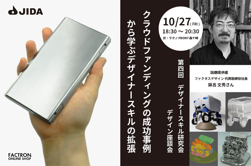 インダストリアルデザイナー、プロダクトデザイナーが企画、設計し商品化したものを効果的に発信し、応援者を集い販売できる「クラウドファンディング」は、デザインビジネスにとって、とても有効な手段です。そこで今回は自社ブランド「FACTRON®」を運営し、その商品群をクラウドファンディングの活用で達成率10000%を成しえた有限会社ファクタスデザイン代表の鉢呂 文秀社長に「デザイナーが仕掛けるクラウドファンディングの成功プロセスと裏話」という話題を提供していただき、座談会形式の対話型セミナーをファクタスデザイン所在地の「テクノFRONT森ケ崎」で開催します。