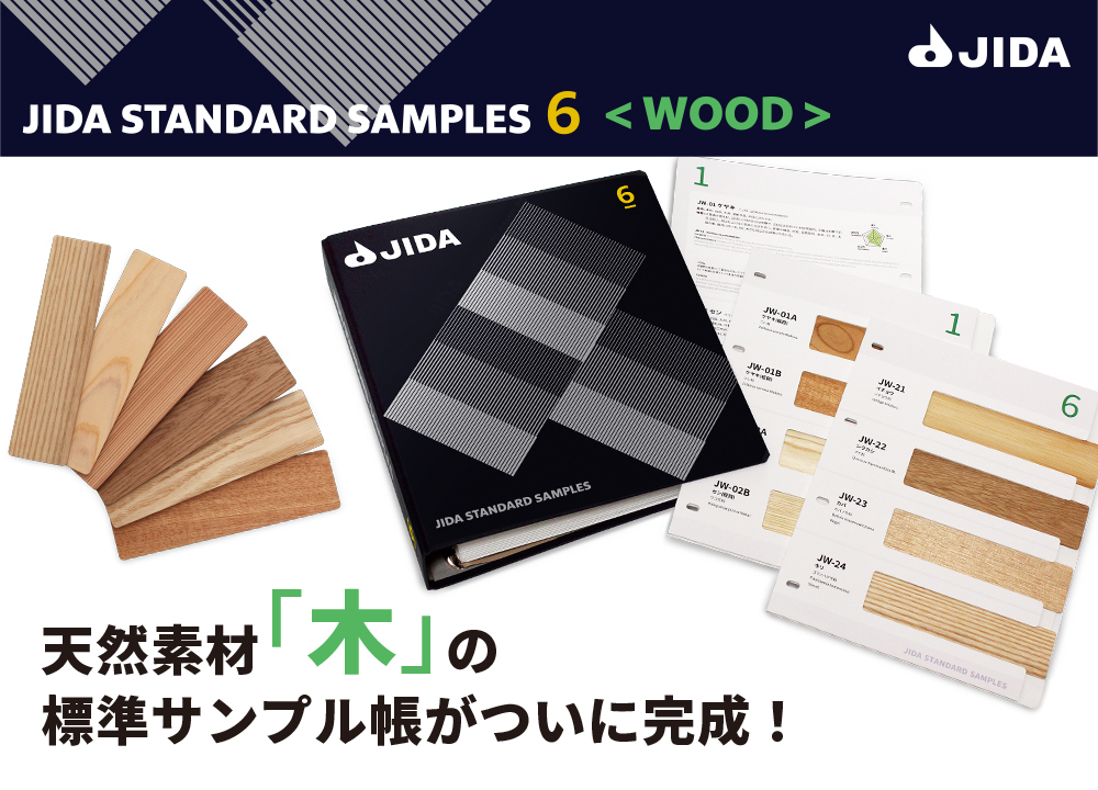 今まで、プラスチック、金属の素材や表面処理を中心としたベーシックなサンプル帳を JIDA STANDARD SAMPLES として提供してまいりましたが、昨今の自然素材を活用したモノづくりが増加している状況を踏まえ、今回は木のサンプル帳を開発、発刊するに至りました。