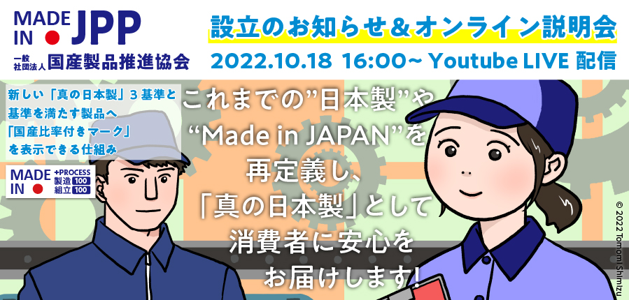 この度、令和4年(2022年)9月12日に一般社団法人国産製品推進協会を設立致しました。当協会では、日本製を再定義した「新しい『真の日本製」3基準」の提唱と、独自にデザイン制定した「国産比率付きマーク」の普及を通じて、消費者への国産製品の普及・啓蒙と、国内雇用の創出や製造技術・サプライチェーンの維持を推進してゆきます。