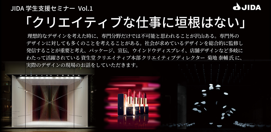 学生支援委員会では、これからデザインの世界に進むため、日々学習している学生の皆さんに向けデザインの現場を理解してもらうことで、現実的で明確な社会への扉を開く手伝いをしたいと考えています。 今回は、資生堂 クリエイティブディレクター 菊地 泰輔 氏をお迎えして、実際のデザインの現場についてお話しいただきます。JIDAギャラリーでのリアル参加は定員20名ですが、直接質問ができる良いチャンスだと思いますので、積極的にご参加ください。